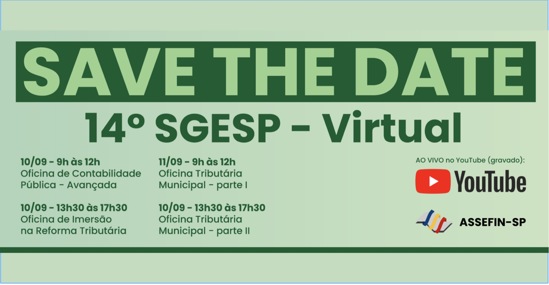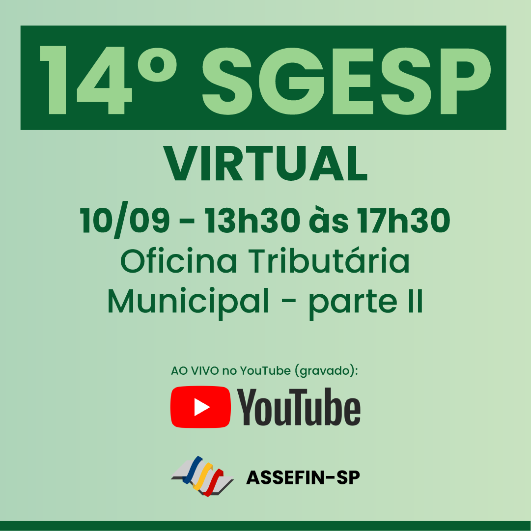 As três oficinas técnicas mais concorridas do 14.º Seminário de Gestão Pública Fazendária – SGESP, realizado nos dias 30 e 31 de julho de 2025, em Ribeirão Preto, serão exibidas no canal SGESP-OFICIAL no YouTube em estreia ao vivo nos dias 10 e 11 de setembro.