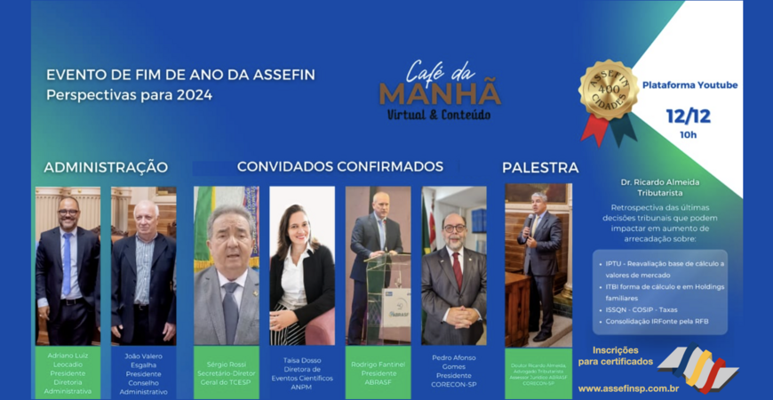 Na próxima terça-feira (12/12), às 10 horas, a ASSEFIN promoverá um Café da Manhã com o renomado tributarista Dr. Ricardo Almeida, ele é Procurador do Rio de Janeiro e assessor Jurídico da ABRASF, em sua palestra ele abordará as diversas decisões do Supremo Tribunal Federal e de segunda instância que têm potencial significativo para impulsionar a arrecadação dos municípios.