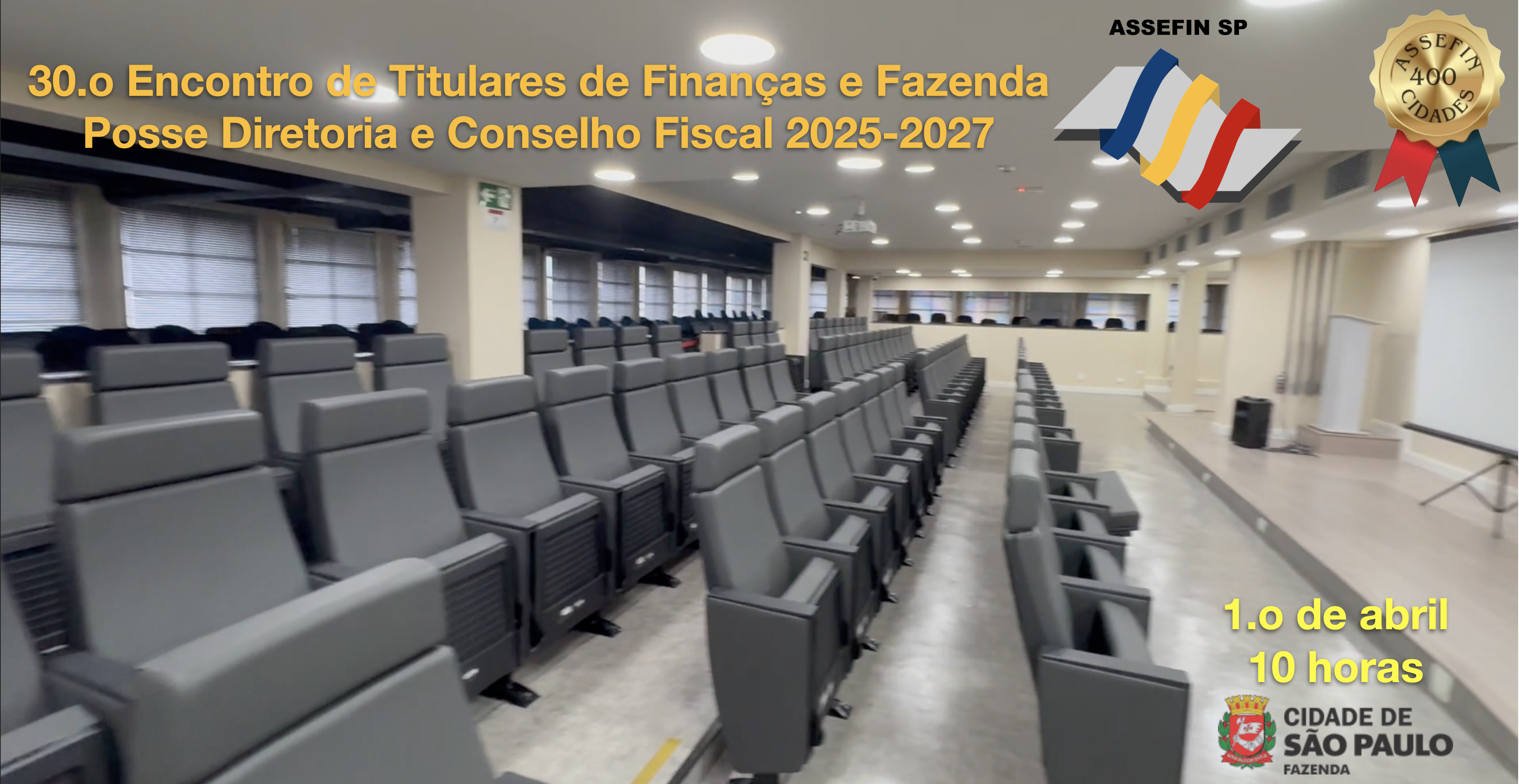 A Associação das Secretarias Municipais de Finanças do Estado de São Paulo (ASSEFIN-SP) realizará a posse de sua nova diretoria no próximo dia 1.º de abril (terça-feira), às 11h, na Secretaria da Fazenda do Município de São Paulo. Antes da cerimônia, haverá uma reunião dos secretários fazendários a partir das 10h, aberta a representantes de todas as cidades paulistas.