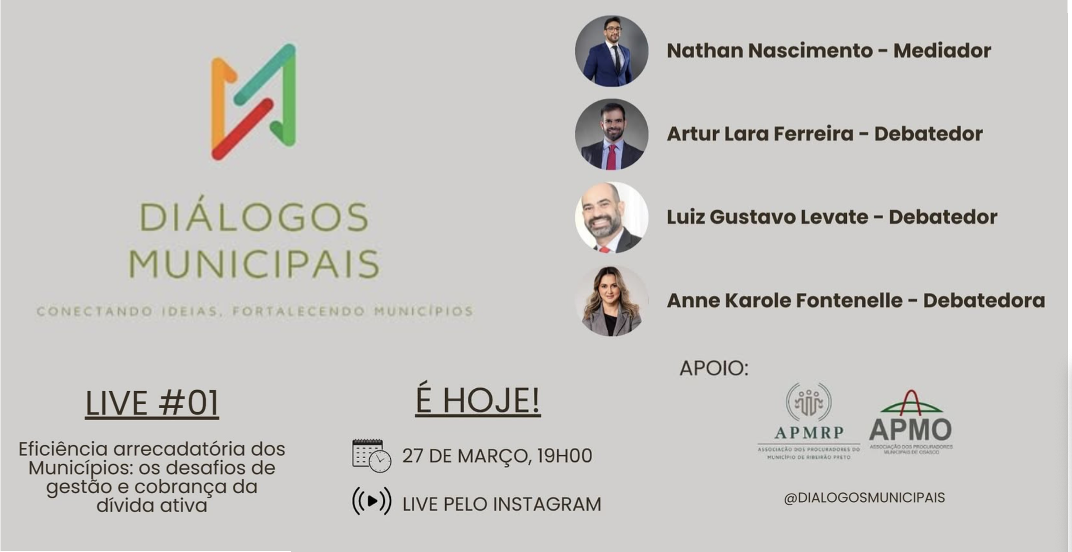 A live de estreia contará com a participação de Anne Karole Fontenelle (ANPM), Artur Lara Ferreira (APMO), Luiz Gustavo Levate e Nathan Nascimento (APMRP), abordando estratégias para a cobrança da dívida ativa e a sustentabilidade financeira das cidades. A transmissão será realizada pelo Instagram (@dialogosmunicipais), permitindo a interação do público com os especialistas.