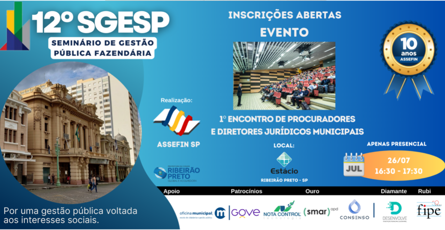 Assim, numa fusão de ideias, a organização do 12.o SGESP resolveu dar o primeiro passo, com o apoio das associações de Procuradores de Osasco e Ribeirão Preto, vai estimular uma reunião durante o Seminário de Gestão Pública Fazendária, que acontecerá na Universidade Estácio, semana que vem, em Ribeirão Preto, quarta (26) e quinta (27).