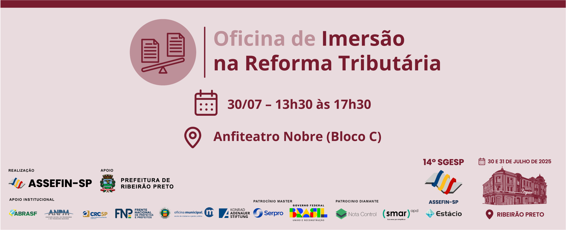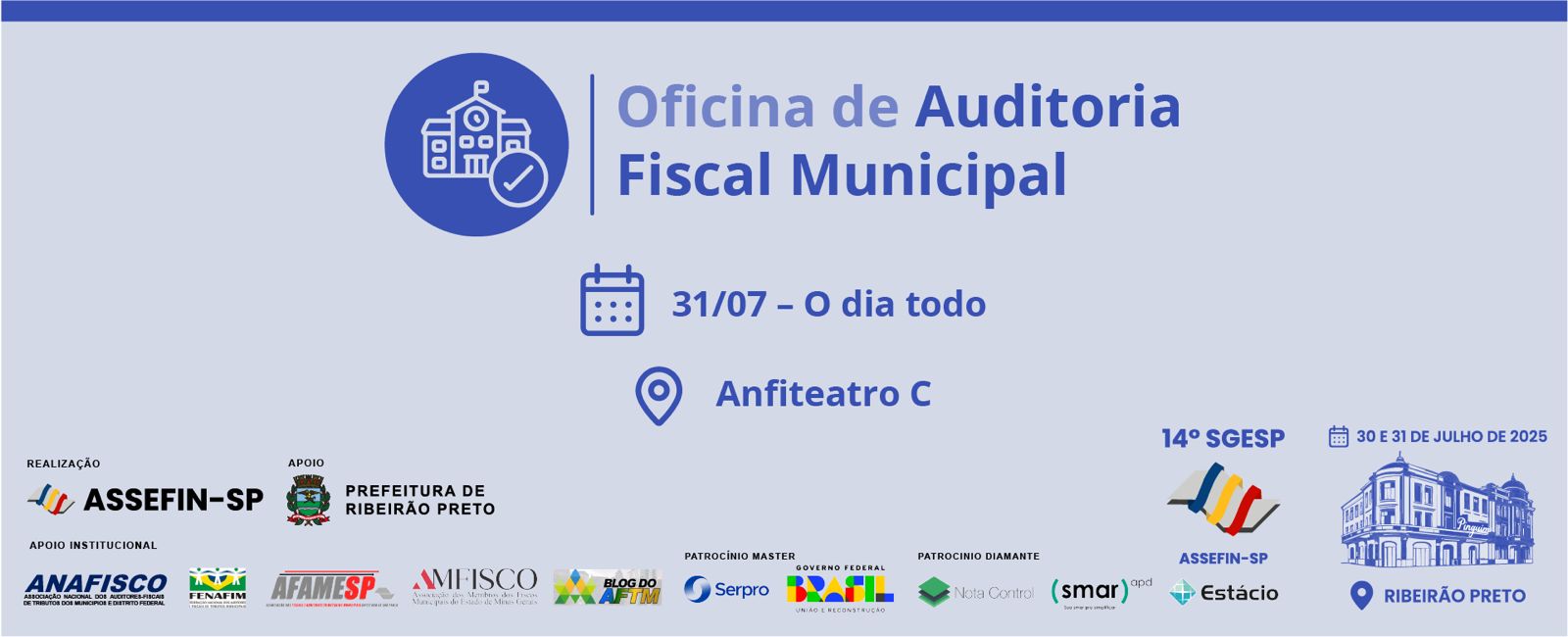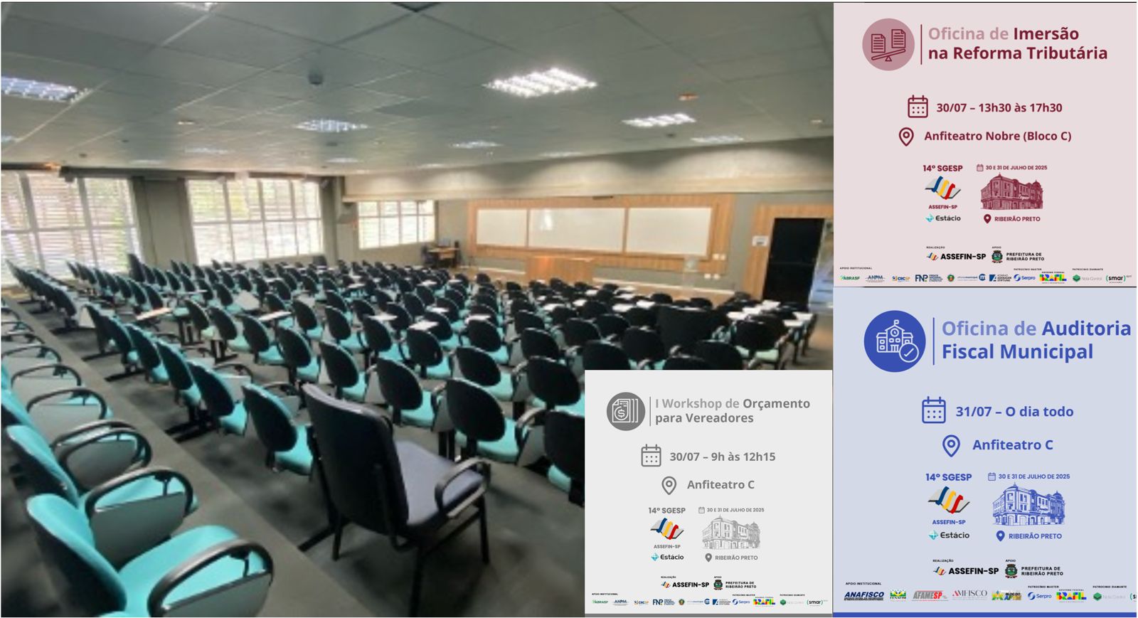 A 14.ª edição do Seminário de Gestão Pública Fazendária (SGESP), promovido pela ASSEFIN-SP, acontecerá nos dias 30 e 31 de julho de 2025, com uma programação intensa voltada à qualificação dos gestores públicos. O evento será realizado no Teatro Principal e nos anfiteatros de Ribeirão Preto, reunindo especialistas e autoridades em finanças públicas para debater temas centrais como inovação, reforma tributária, contabilidade, auditoria e orçamento municipal.