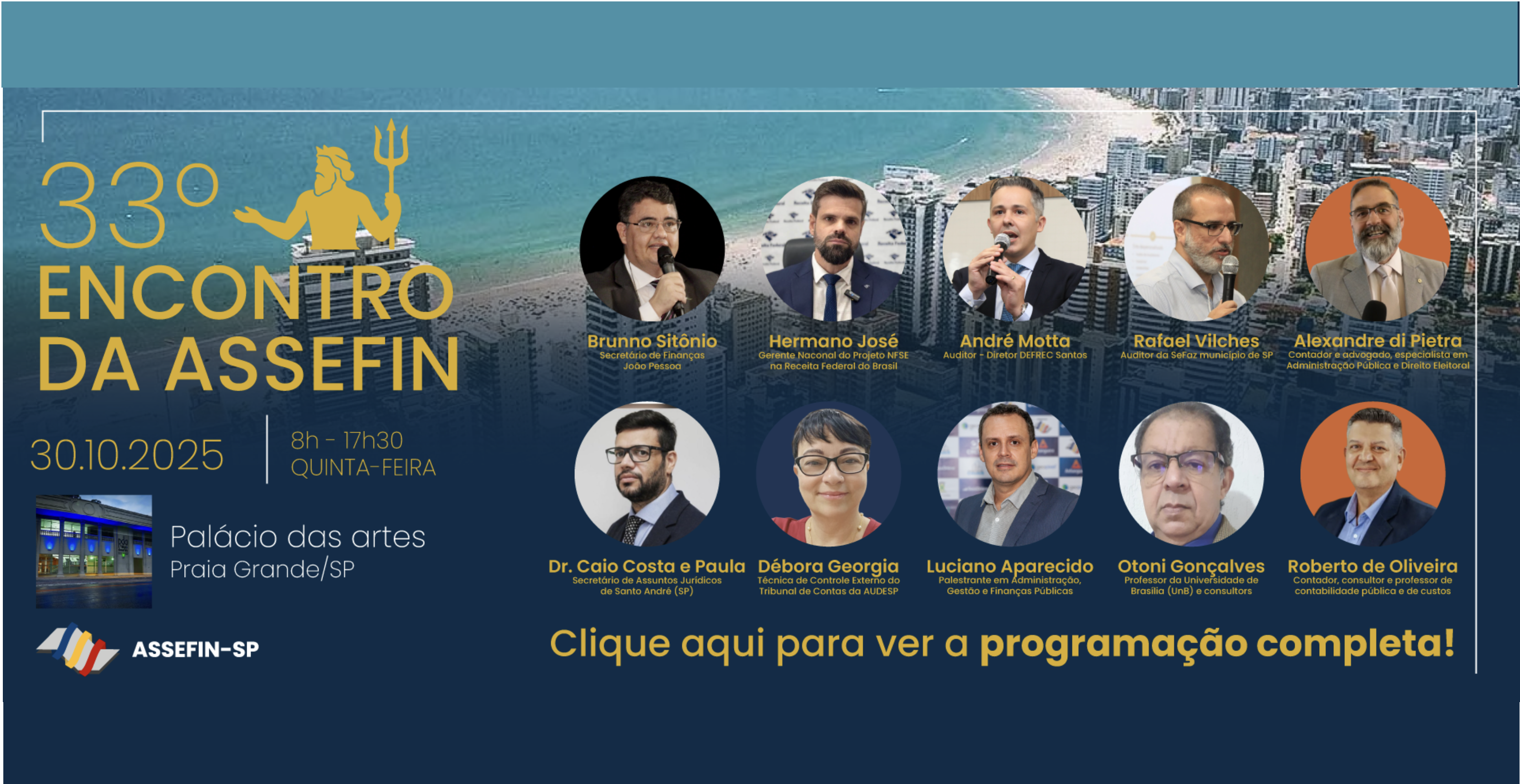 A ASSEFIN-SP – Associação das Secretarias Municipais de Finanças do Estado de São Paulo realiza, no dia 30 de outubro de 2025, no Palácio das Artes, em Praia Grande (SP), o 33.º Encontro de Servidores e Dirigentes Fazendários.