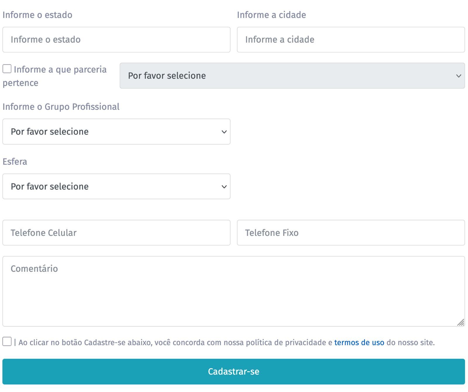 A indicação da esfera de atuação — pública ou privada — também é obrigatória, pois ela determina os níveis de acesso e as permissões no site, especialmente para servidores públicos de prefeituras associadas.