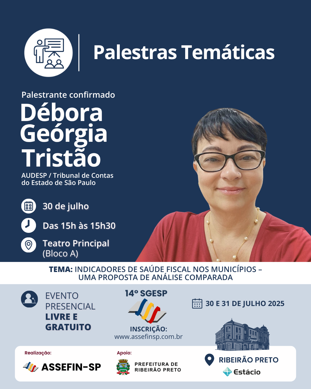 Às 15h15, será a vez de Débora Geórgia Tristão, da AUDESP do Tribunal de Contas do Estado de São Paulo – TCESP, com a palestra “Indicadores de Saúde Fiscal nos Municípios – Uma proposta de análise comparada”. A apresentação traz uma adaptação brasileira do Teste de 10 Pontos de Kenneth Brown, que avalia a solvência e sustentabilidade financeira dos governos locais. Débora é mestranda pela FGV e multiplicadora da STN em contabilidade pública.